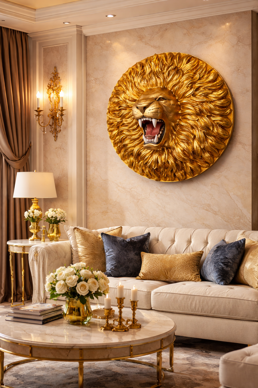Mekânınıza prestij, güç ve karakter katmak için tasarlanan fiberglass aslan duvar dekoru, detaylı işçiligi ve etkileyici duruşuyla ilk bakışta fark yaratır. Aslanın kükreyen ifadesi ve altın tonlu yüzeyi, bulunduğu ortama güçlü bir görsel etki kazandırır.