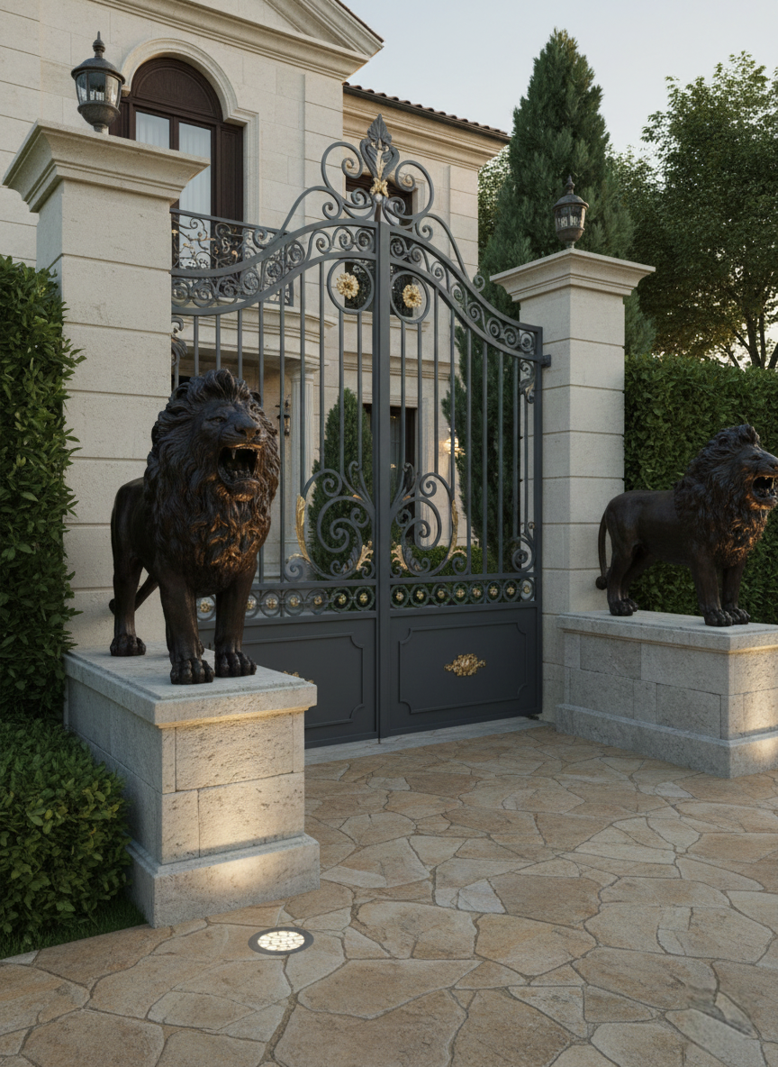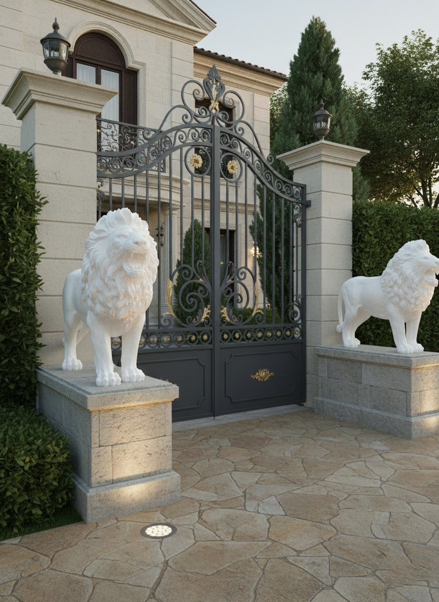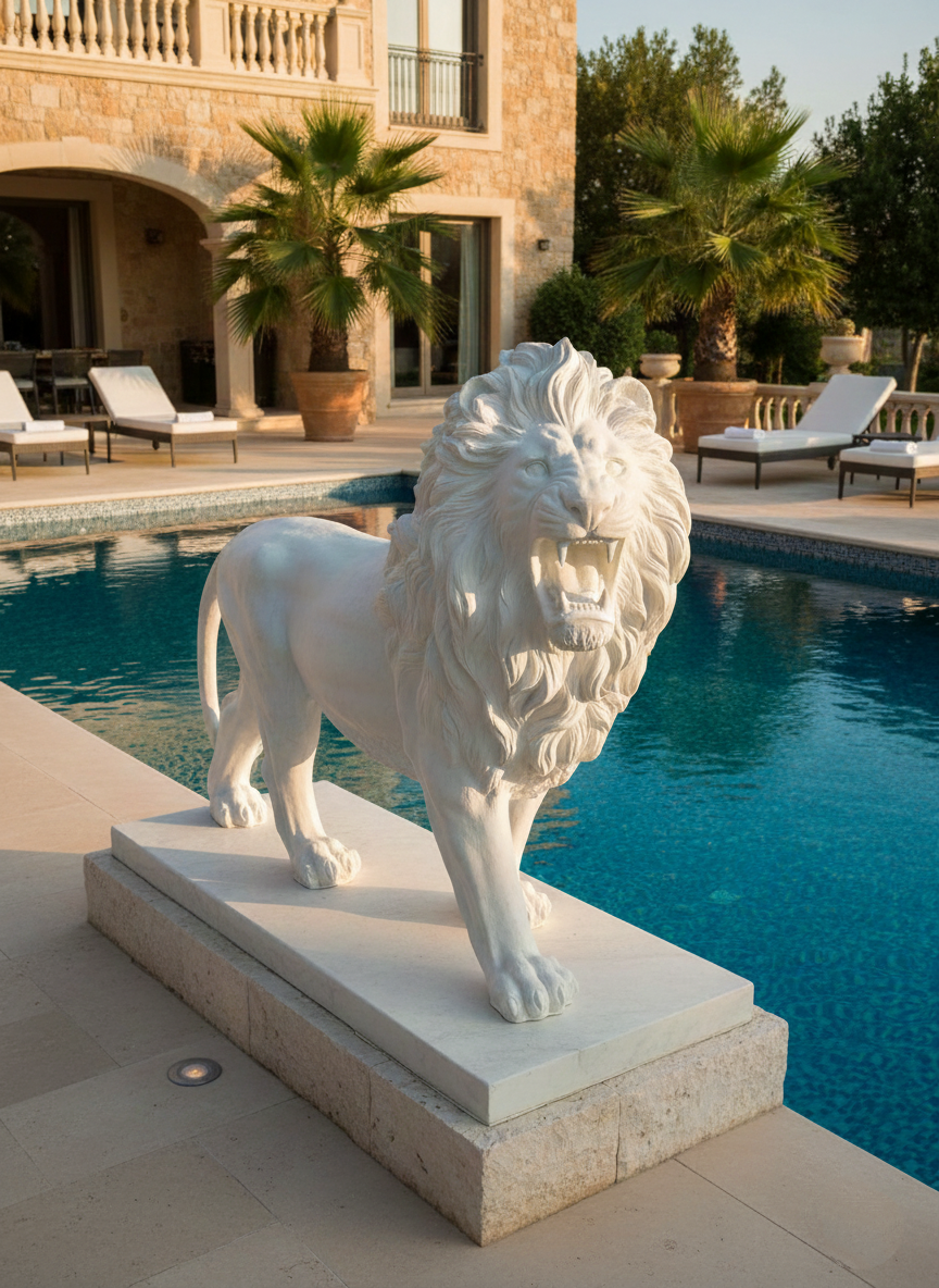 Mekânlara ilk bakışta otorite, prestij ve estetik kazandıran fiberglass aslan heykelleri, güçlü duruşu ve detaylı işçiliğiyle bulunduğu alanın odak noktası olur. Bahçe, villa girişi, site kapısı, havuz kenarı ve kurumsal alanlar için özel olarak tasarlanmıştır.